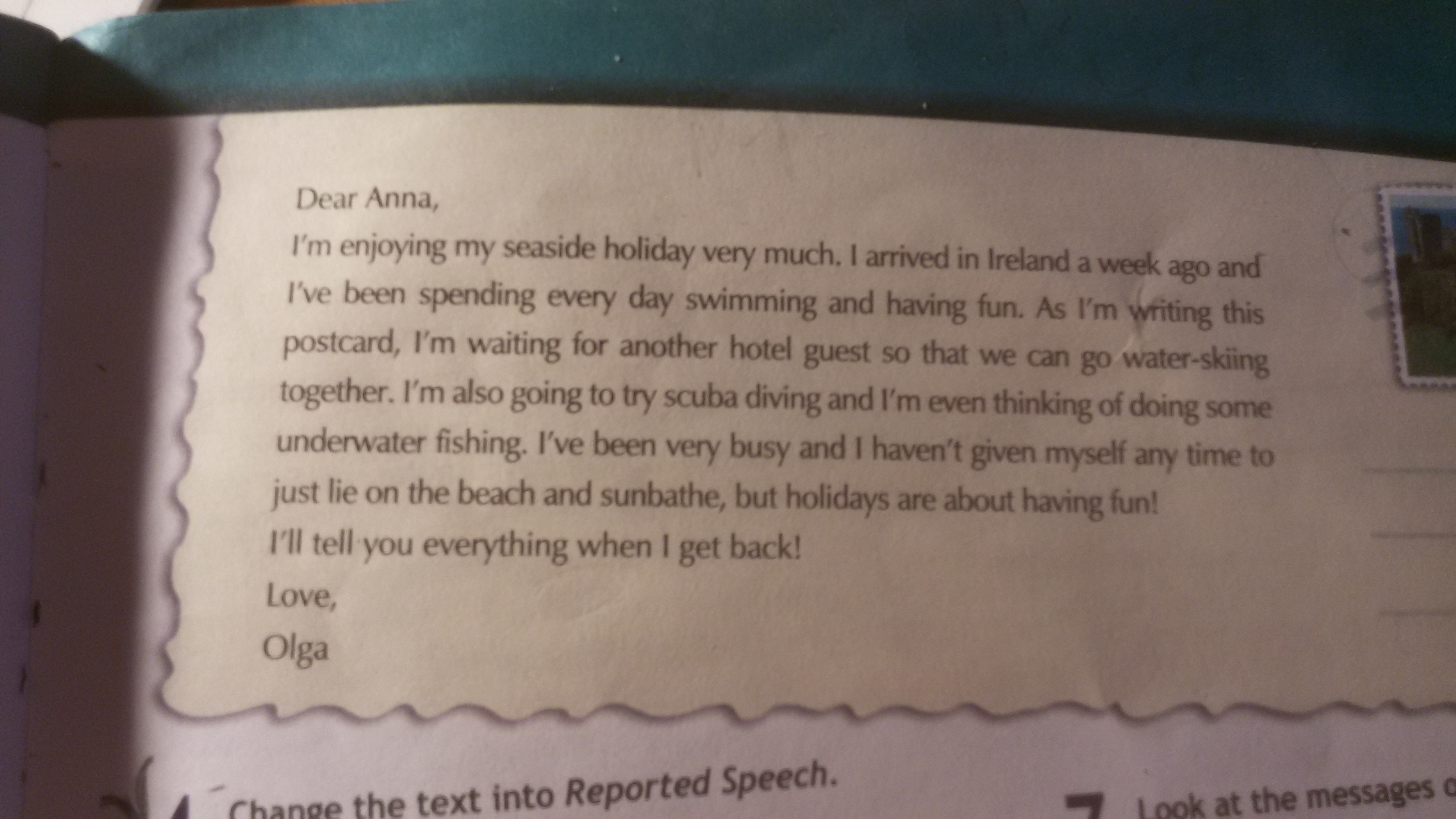 Olga told Anna that she was enjoying her deaside holiday very much. She said that she had arrived in Ireland the week before and she had been spending every day swimming and having fun. She said that as she was writing that postcard? she was waiting for another hotel guest so that they could go water-skiing together. She said that she was also going to try scuba diving and she was even thinking of doing some underwater fishing. She said that she had been very busy and she hadn't given herself any time to just lie on the beach and sunbathe, but holidays were about having fun. She said that she would tell Anna everything when she got back.