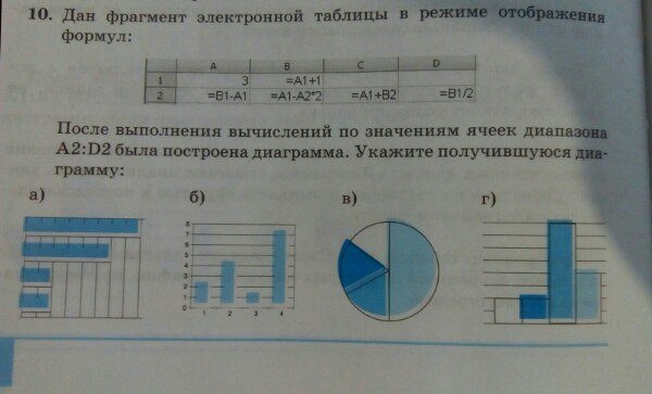 После выполнения вычислений по значениям ячеек диапазона A2:D2 была построена диаграмма. Укажите получившуюся диаграмму.