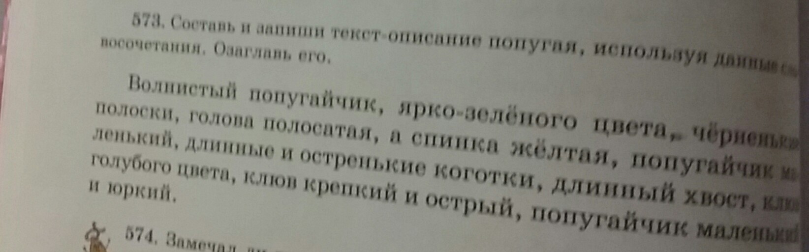 Русский упражнение 573 Составь и запиши текст описание попугая используя данные словосочетания Озаглавьте его волнистый попугай ярко-зеленого цвета черный чёрненький полоска полосатая спинка жёлтые попугаи маленькие длинные остренькие кого длинный хвост и клюв голубого цвета клюв крепкие острый попугайчик маленькие Йорки