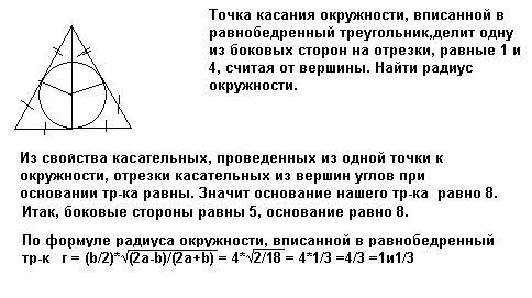 Точка касания окружности, вписанной в равнобедренный треугольник,делит одну из боковых сторон на отрезки, равные 1 и 4, считая от вершины. Найти радиус окружности.