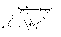 Тр-ки abm и kcd равны и равнобедренные, так как равны углы a и c, <сdk = <abm = =<ckd = <bma . Значит kc=am, а bk=md.
