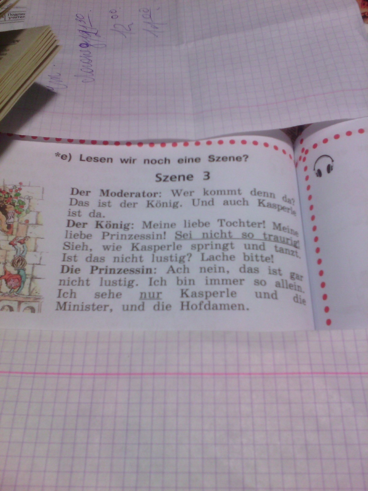 Король:Моя любимая (дорогая) дочь! Моя любимая ( дорогая) принцесса! Не будь такой грусной ( печальной)! Смотри Петрушка прыгает и танцует. Это не весело? Посмейся пожалуйста!