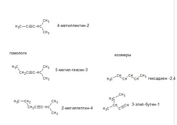 СН3 - С тройная связь С - СН(СН3) - СН2 - СН2- СН3 4-метилгексин-2