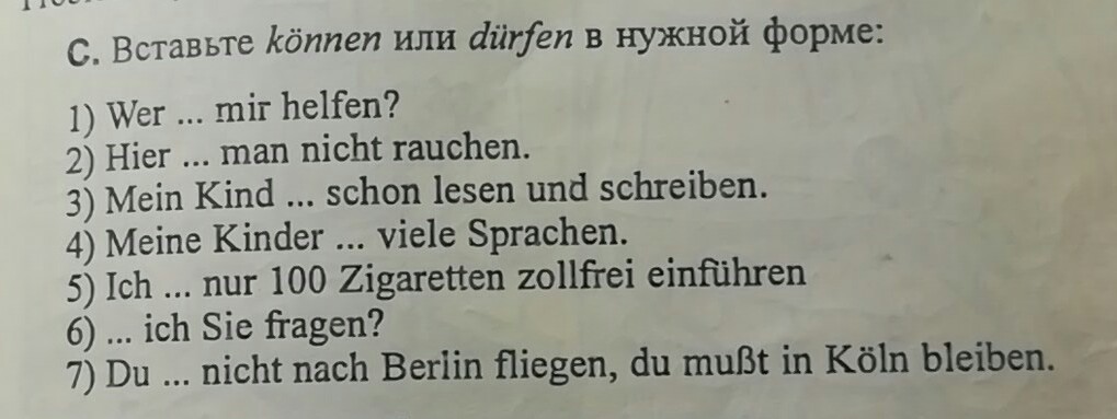7. Du darfst nicht nach Berlin fliegen, du musst in Köln bleiben ( не можешь в смысле тебе нельзя, ты должен в Кёльне остаться)