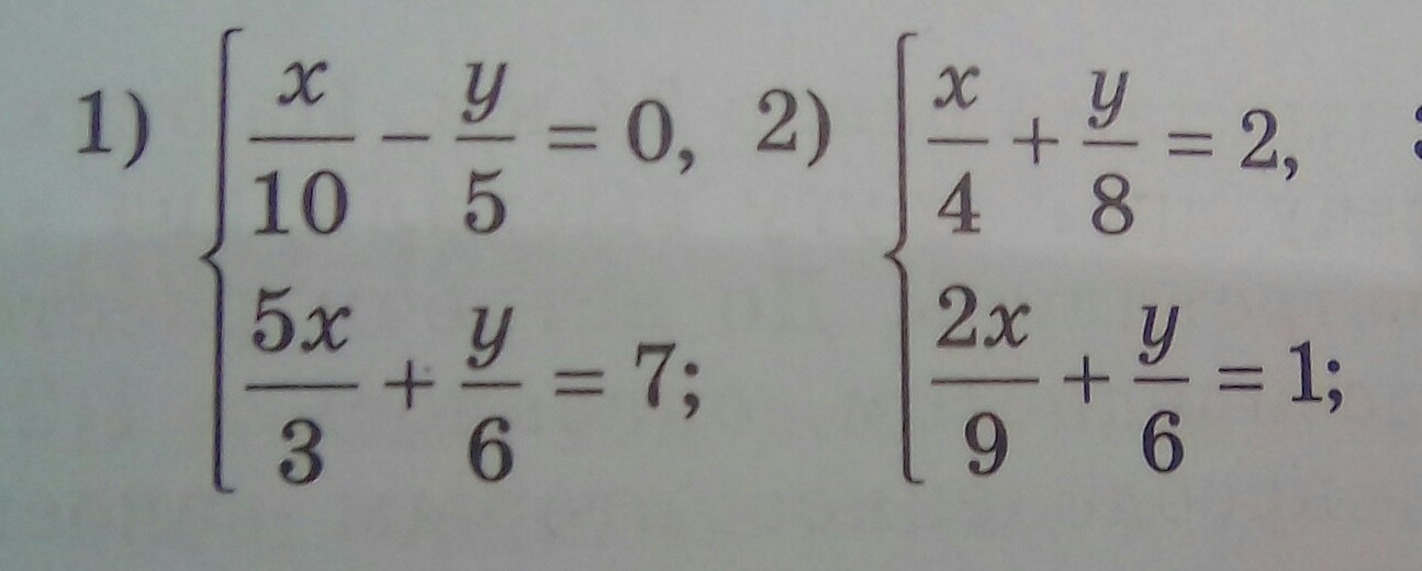 1) проще всего решить так: сначала избавимся от дробности, для этого домножим обе части уравнения (левую и правую) на одно и то же число, а именно НОК знаменателлей (по каждому уравнению отдельно). Т.е. верхнее уравнение будем домножать на 10, а нижнее на 6. У нас получится система: