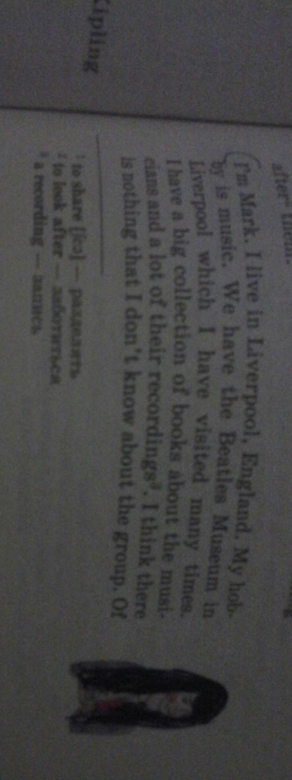 Я Марк. Я живу в Ливерпуле, в Англии. Мое хобби- музыка. В Ливерпуле есть музей группы Битлз, который я посетил много раз. У меня есть большая коллекция книг о музыкантах и многих их записях. Я думаю нет ничего, что я не знаю об этой группе.