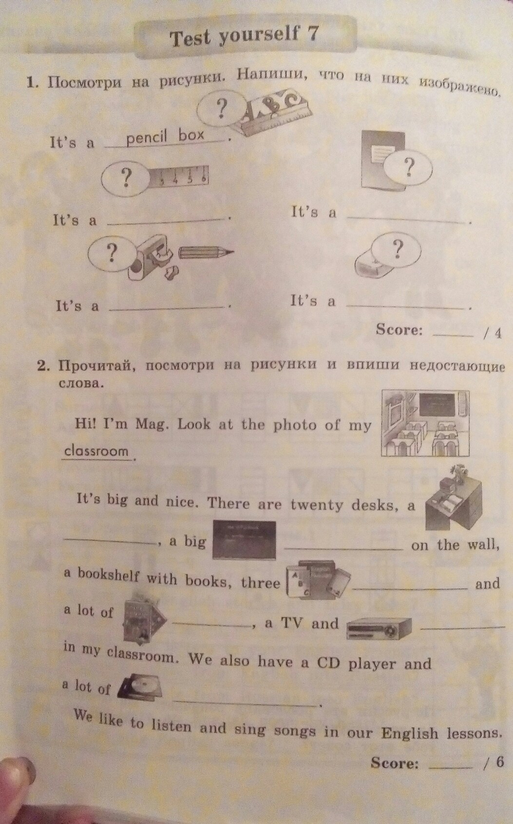 2. It's big and nice. There are twenty desks, a table, a big board on the wall, a bookshelf with books, three books and a lot of notebooks, a TV and record player in my classroom. We also have a CD player and a lot of disks.