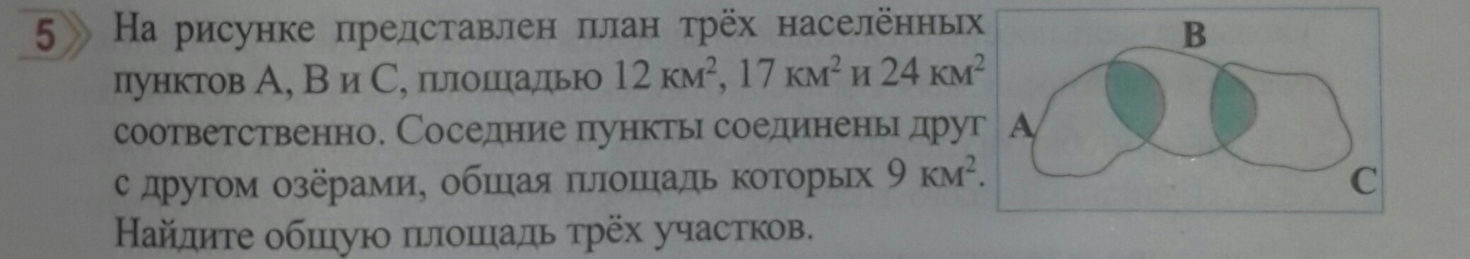 Общая площадь = Sa + Sb + Sc - Sозер = 12+17+24-9=44