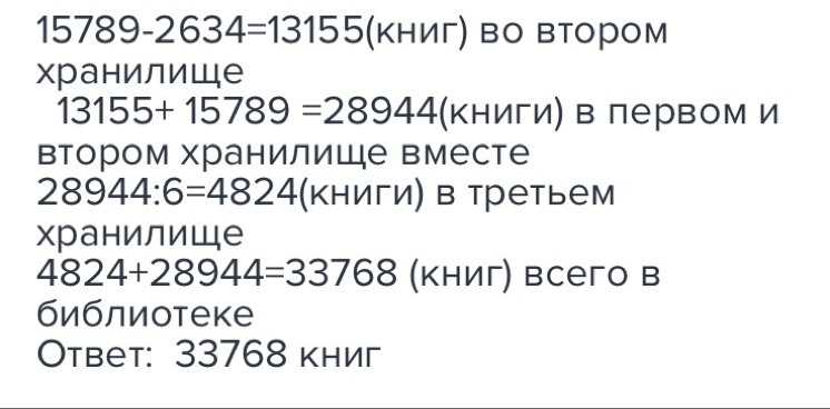 1)15789-2634=13155(книг) во втором хранилище2)13155+ 15789 =28944(книги) в первом и втором хранилище вместе3)28944:6=4824(книги) в третьем хранилище4)4824+28944=33768 (книг) всего в библиотекеОтвет: 33768 книг