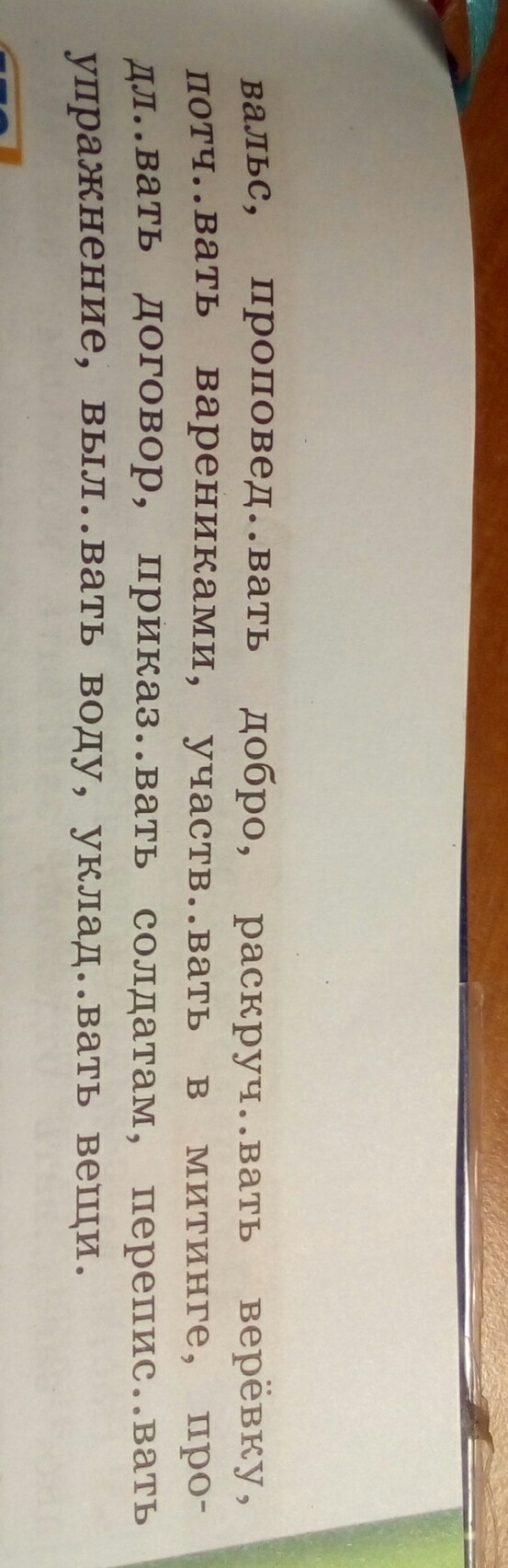 проповедовать,раскручивать верёвку, потчевать варениками, участвовать в митинге, продлевать договор, приказывать солдатам, переписывать упражнение, выливать воду, укладывать вещи.