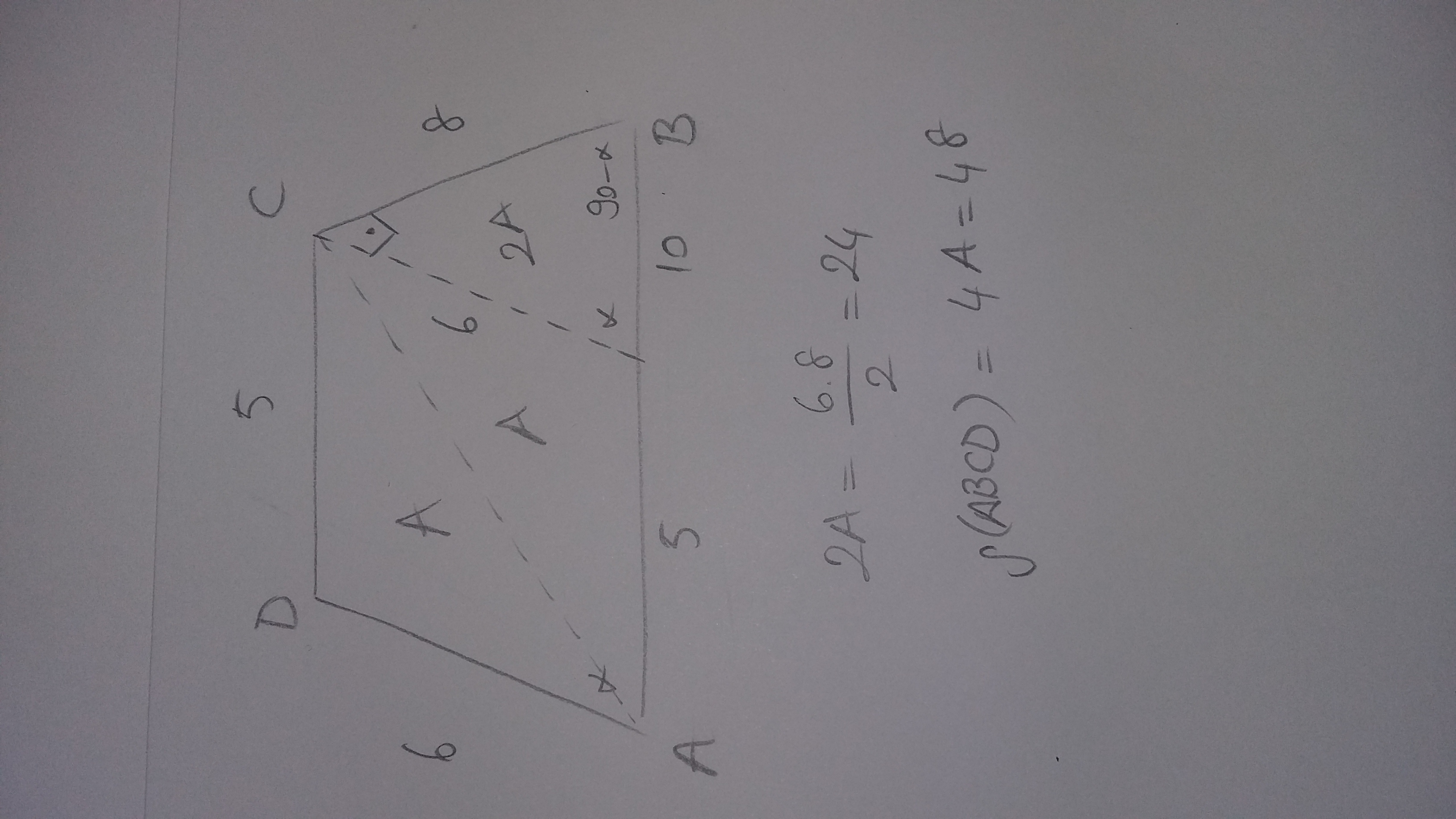 В трапеции ABCD AD=6, DC=5, CB=8 ∠A+∠B=90. Найдите площадь трапеции.