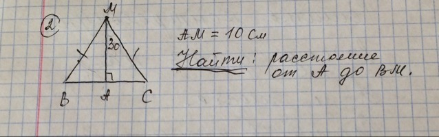 Дано: треугольник BMC-равнобедренный MA- высота, угол AMC=30 градусам, MA=10 см найти расстояние от A до BM
