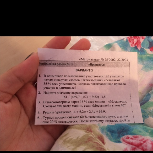 1. В олимпиаде по математике участвовали 120 учащихся пятых и шестых классов. Пятиклассники составляют 55% всех участников. Сколько пятиклассников приняло участие в олимпиаде? 2. Найди значение выражения 161-(469,7:15,4+9,52)•1,5=. 3. В таксомоторном парке 16% всех машин -,, Москвичи". Сколько там всего машин,если ,,Москвичей" в нём 40? И ещё 4,5