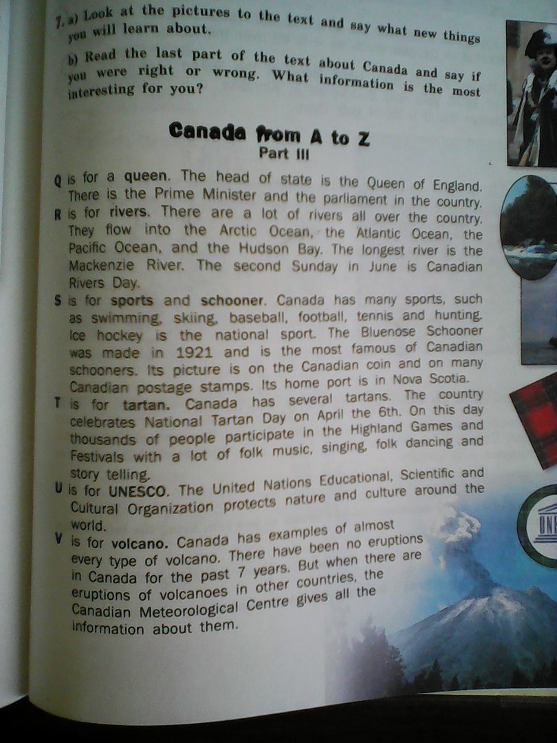 Самая интересная мама от Канады до Малайзии. Часть III - для королевы. Глава государства - королева Англии. Есть премьер-министр и парламент страны R для рек. В стране много рек. Они впадают в Арктику, океан, Атлантический океан, Тихий океан и Гудзоновую бухту. Самая длинная река - река Маккензи. Второе воскресенье июня - День канадских рек S для спорта и шхуны. В Канаде много видов спорта, таких как плавание, лыжи, бейсбол, футбол, теннис и охота. Schooner lce hockey - национальный вид спорта. Bluenose был сделан в 1921 году и является самой известной канадской шхуной. Его изображение на канадской монете и на многих канадских почтовых марках. Его собственный порт находится в Новой Шотландии. Для тартана. В Канаде несколько тартанов. Национальный День Тартана 6 апреля. В этот день тысячи людей участвуют в Хайлендских играх и фестивалях с большим количеством народной музыки, пения, народных танцев и рассказов. Организация Объединенных Наций по вопросам образования, Уральская организация защищает природу и культуру вокруг своей территории. Что касается вулкана. В Канаде есть примеры почти мира. Вуе - тип вулкана. Там, где в течение последних 7 лет в других странах не было извержений, извержения Метеорологический центр дает всем канадцам примерно