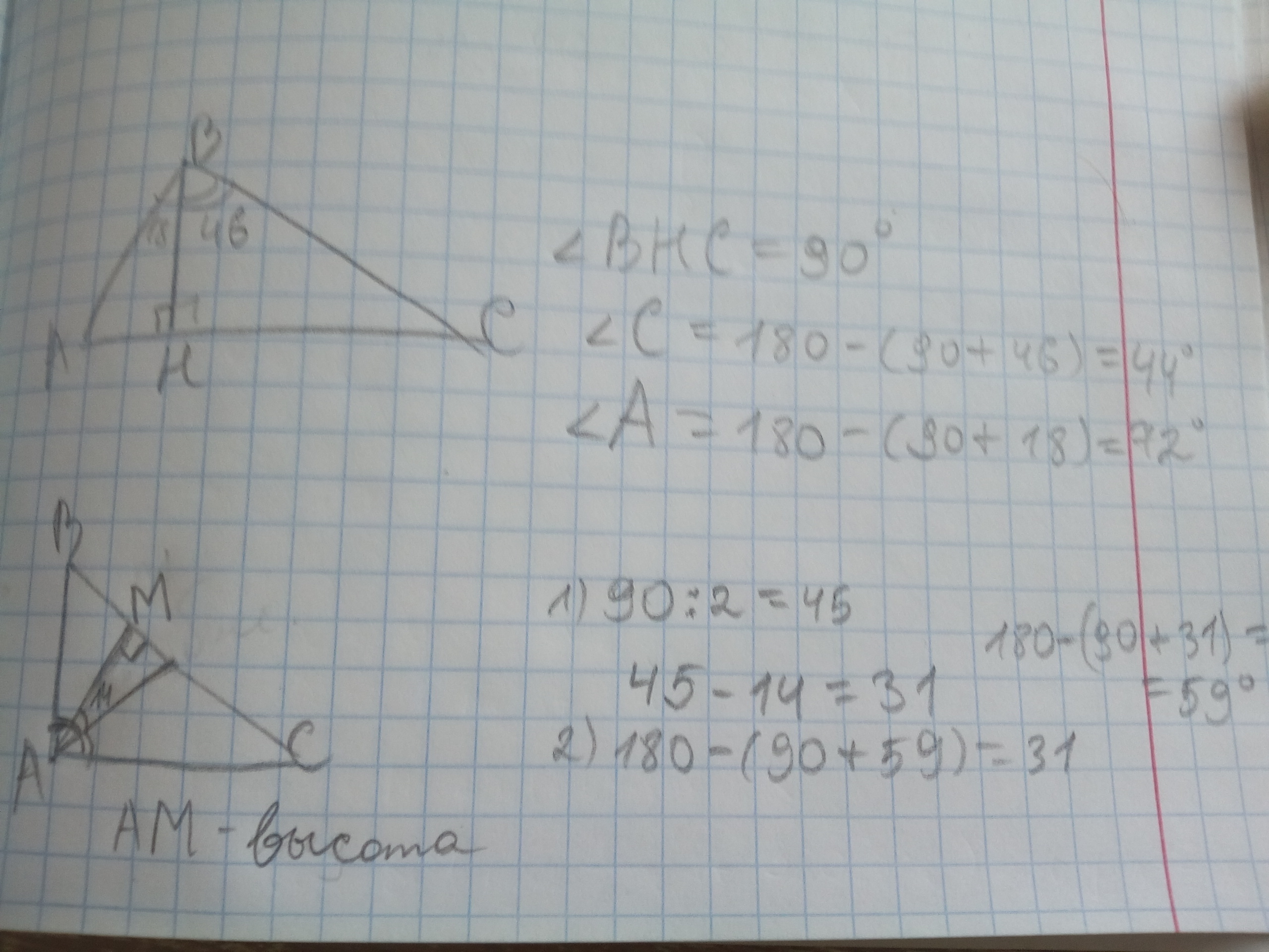 угол BHC=90,т.е.угол С=180-(90+46)=44