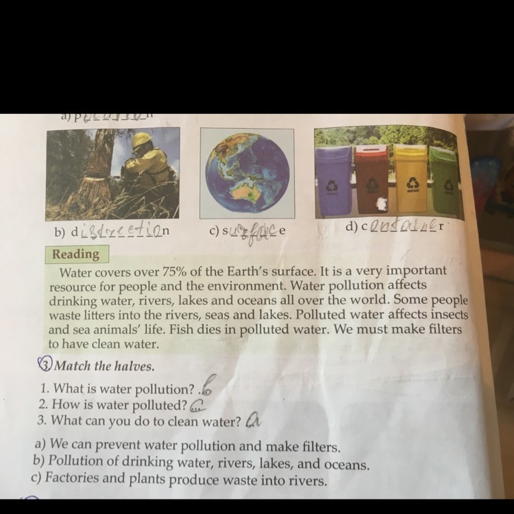 Вода покрывает свыше 75% поверхности Земли. Это очень важный ресурс для людей и окружающей среды. Загрязнение воды пагубно влияет на питьевую воду, реки, озера и океаны во всем мире. Некоторые люди выбрасывают мусор в реки, моря и озера. Загрязненная вода пагубно влияет на жизнь насекомых и морских животных. Рыбы умирают в загрязненной воде. Мы должны делать фильтры чтобы очистить воду.