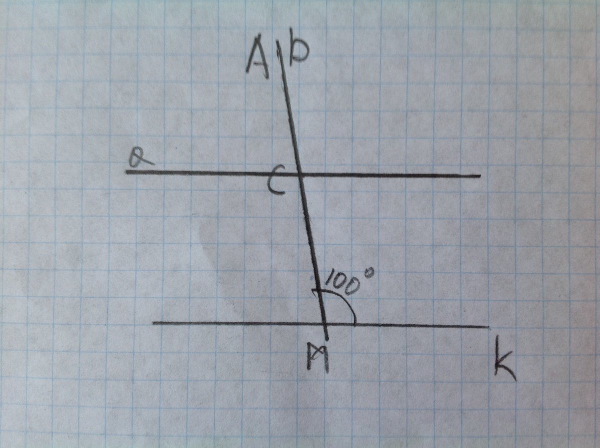 Чертим угол АМК 100*. Отмечаем точку С на стороне угла АМ. И проводим через эту точку прямые(Ча напишу на бумаге)