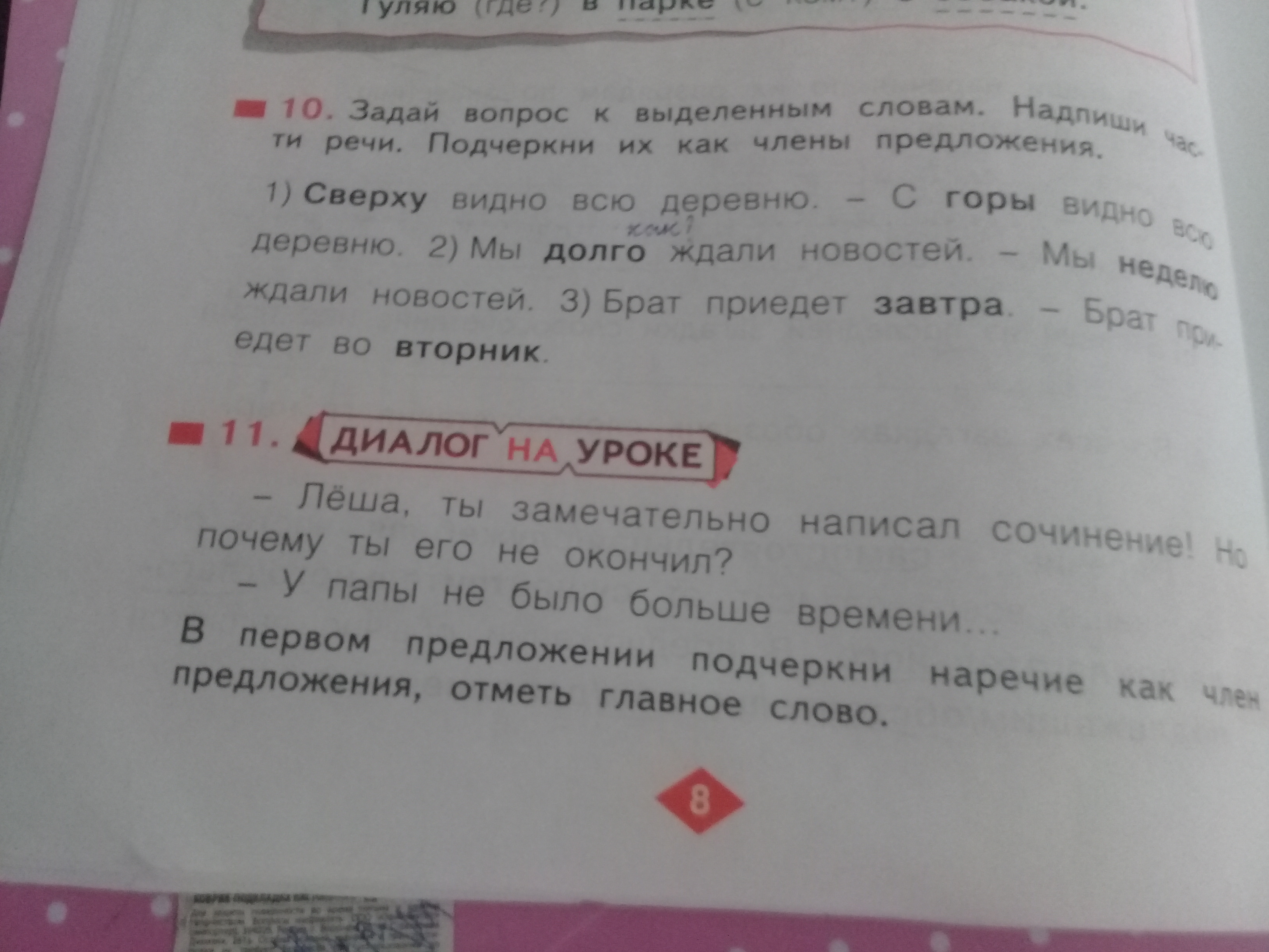 Сверху(откуда?), с горы(откуда?), долго(как?), неделю(сколько?), завтра(когда?), во вторник(когда?).