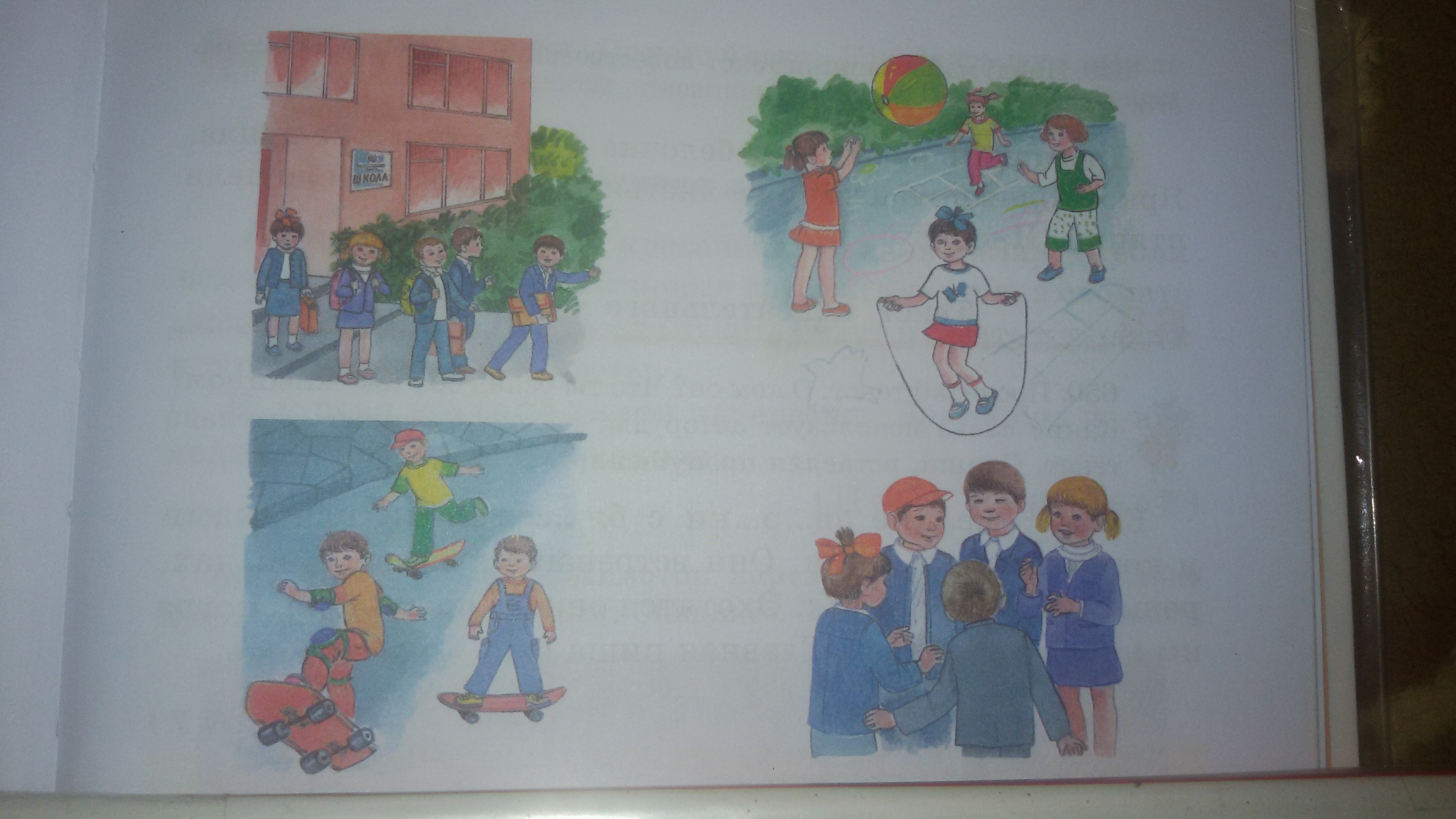 Дети возвращались из школы к себе домой. Ребята весело играли на улице. Мальчишки решила покататься на скейтах. Друзья о чем-то беседовали после звонка на перемену.
