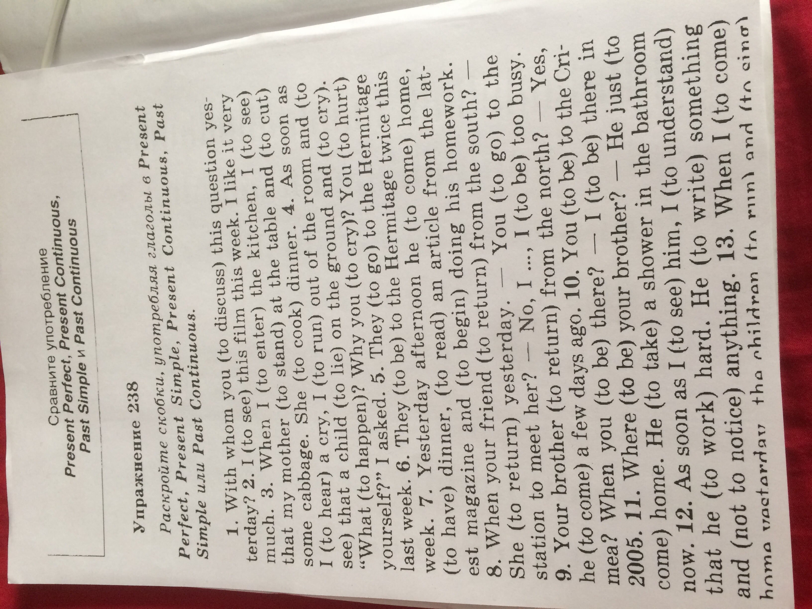 1. With whom did you discuss. 2. I have seen. 3. I entered, I saw, my mother was standing, cutting, she was cooking. 4. I heard, I ran, saw, a child was lying, crying, what has happened, why are you crying, have you hurt. 5. They went. 6. They have been. 7. He came, had, read, began. 8. When did your friend return, she returned, did you go, I didn't, I was. 9. Has your brother returned, he came. 10. Have you been, when were you, I was. 11. Where is your brother, he has just come, he is taking. 12. I saw, I understood, he was working, he was writing, did not notice. 13. I came