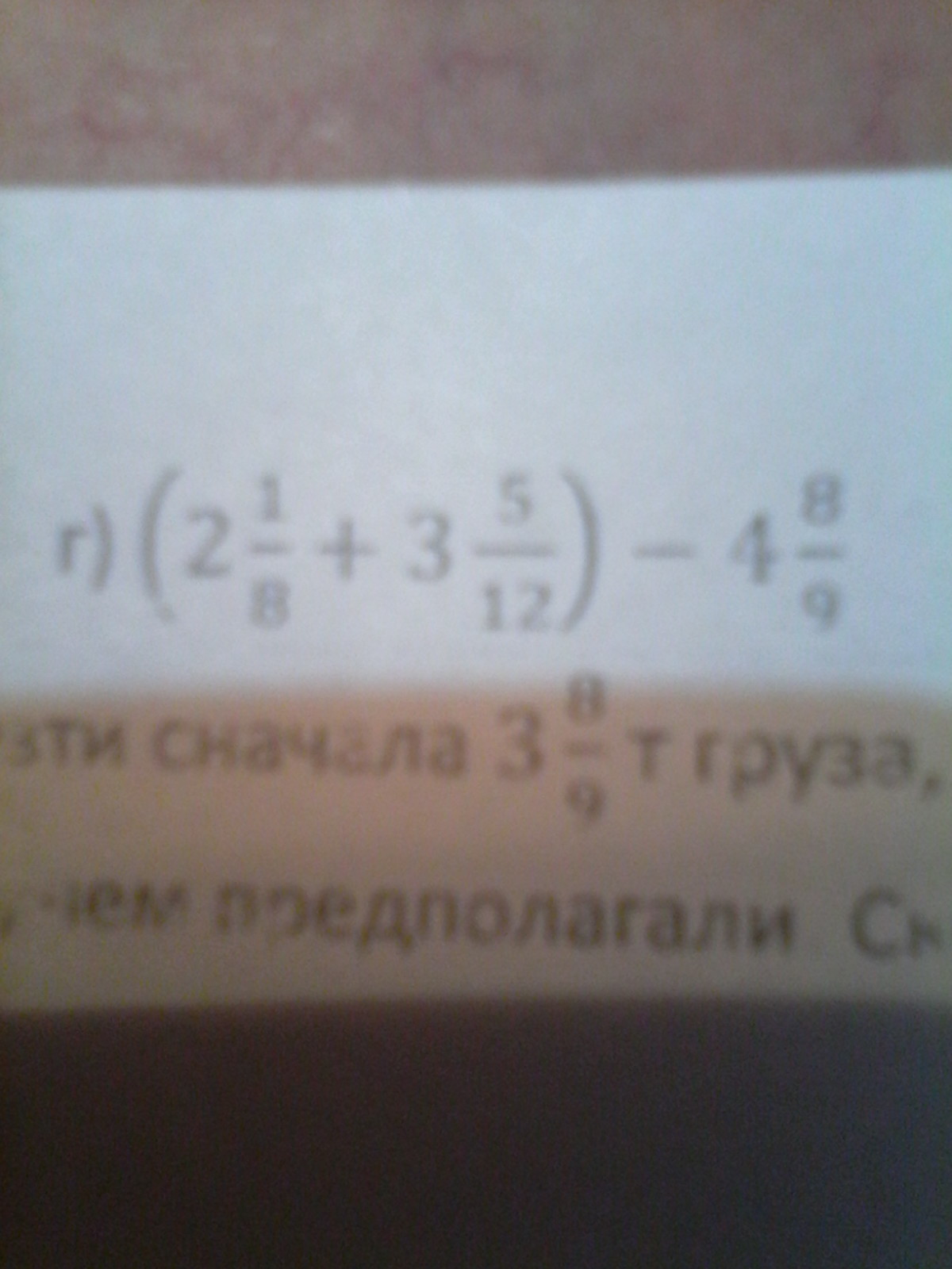5 целых(1/8+5/12)-4 целых 8/9= 5 ц.13/24-4ц.8/9=1ц.(13/24-8/9)=1ц(39-64)/24=(24+39-64)/24=(63-64)/24=-1/24