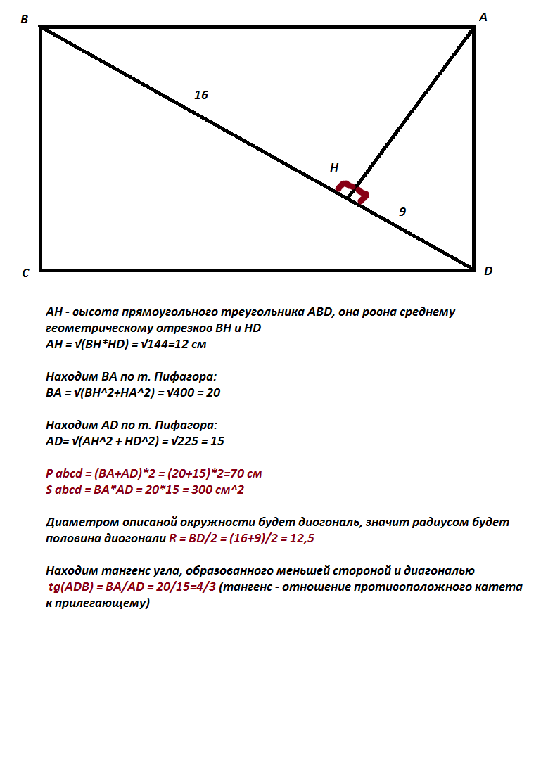 Из вершины А прямоугольника АВСD проведен перпендикуляр надиагональ BD, который делит ее на отрезки длиной 9 см и 16 см.Найти:а) периметр и площадь прямоугольника ABCD;б) тангенс угла, образованного меньшей стороной и диагональю;в) радиус окружности, описанной около прямоугольника ABCD.