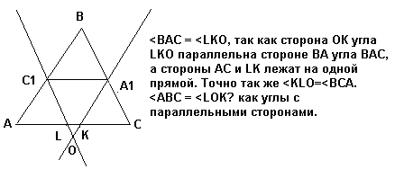 Если можно то поожалуйстаа с рисунком))в тр-ке АВС проведена прямая параллельная стороне ас которая пересекает сторону АВ в точке С1, а сторону ВС- в точке А1. Через точку А1 проведена прямая, параллельная стороне АВ, она пересекает сторону АС- в точке К. Через точку С1 проведена пряма, параллельная стороне ВС,которая пересекает сторону АС в точке L. Прямые А1К и С1L пересекаются в точке О.Докажите что углы треугольника АВС равны углам тругольника ОКL.