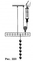 Определите показание динамометра (рис. 223), если вес каждого шарика равен 10 Н. Рычаг находится в равновесии. (Весом блока пренебречь.) желательно решить как задачу
