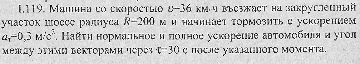 Машина со скоростью 36 км/ч въезжает на закругленный участок шоссе радиуса 200 м и начинает тормозить с ускорением 0,3 м/с^2