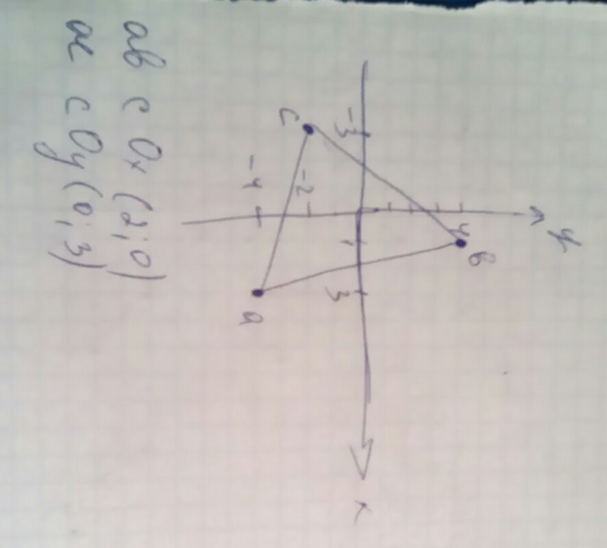 обьетните начертить на координатной плоскости треугольник ABC если а(3;-4) в(1;4) с(-3;-2).найти координаты точек пересечения стороны ав с осью х и стороны ас с осью у