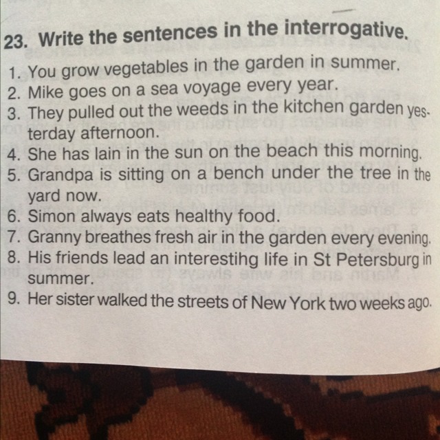 granny doesn't breathe fresh air in the garden every evening. his friend doesn't lead an interesting life in st Petersburg in summer. Her sister didn't walk the streets of New York two weeks ago.