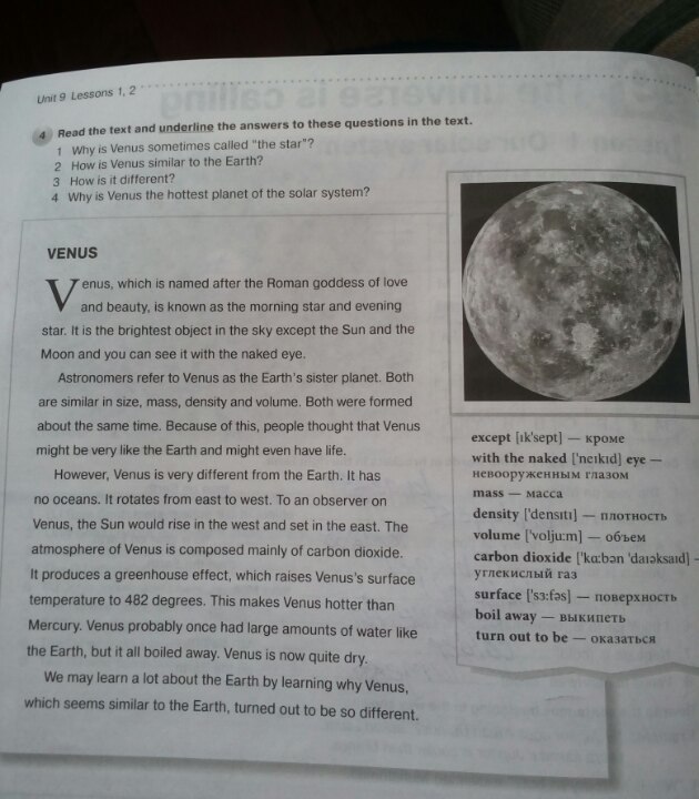 Энус , который назван в честь римской богини любви и красоты, известен как утренняя звезда и вечерняя звезда. Это самый яркий объект на небе, кроме Солнца и Луны, и вы можете видеть его невооруженным глазом. Астрономы называют Венеру сестрой планеты Земля. Оба они схожи по размеру, массе, плотности и объему. Оба были сформированы примерно в то же время. Из-за этого люди думали, что Венера может быть очень похожа на Землю и может даже иметь жизнь. Однако Венера сильно отличается от Земли. У него нет океанов. Он вращается с востока на запад, Наблюдателю на Венере, Солнце восходит на западе и садится на восток. Атмосфера Венеры состоит в основном из углекислого газа. Это производит парниковый эффект, который поднимает температуру поверхности Венеры до 482 градусов. Это делает Венеру более горячей, чем Меркурий. На Венере, вероятно, когда-то было большое количество воды, как на Земле, но все это было вареной, теперь Венера совершенно сухая. Мы можем много узнать о Земле, узнав, почему Венера, которая кажется похожей на Землю, оказалась настолько различной.