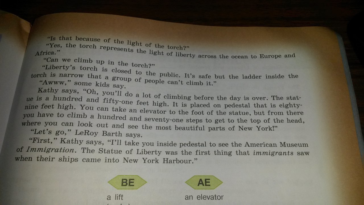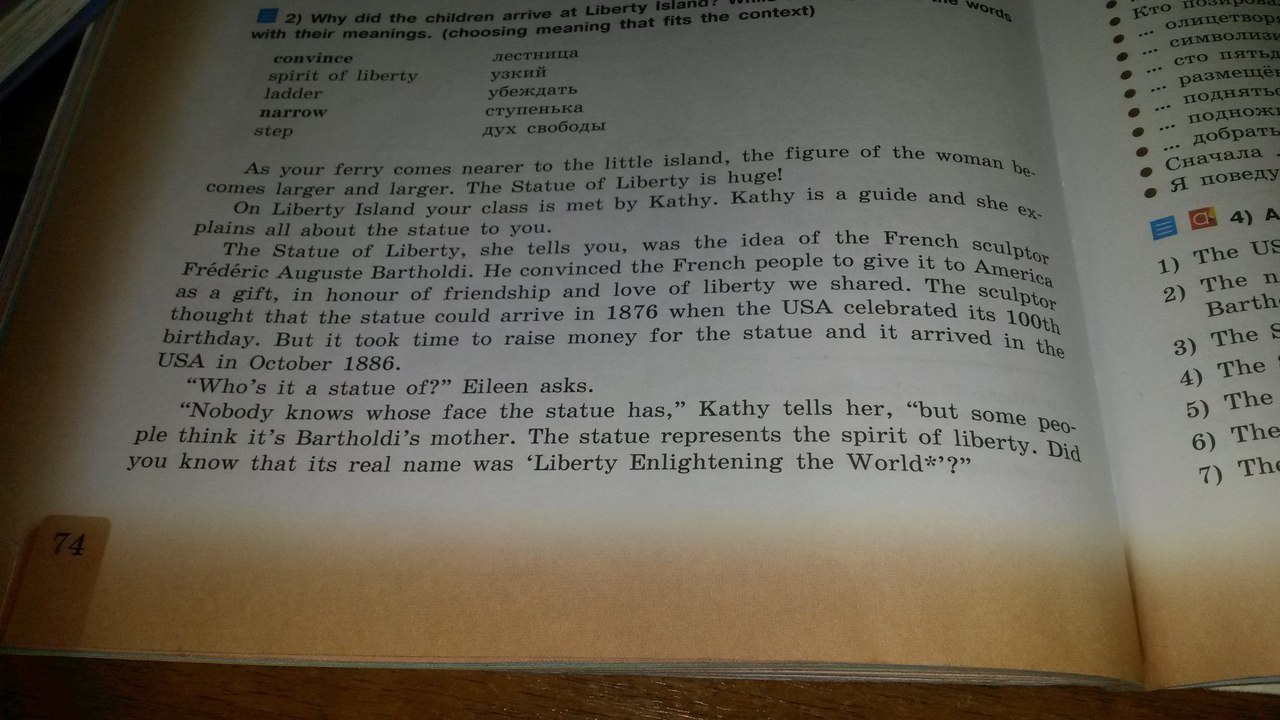 статуя свободы, она говорит вам, была идеей французского скульптора (его имя),он убедил французов подарить америке подарок в честь дружелюбия и чтобы поделиться любовью к свободе. скульптор думал что статую смогут привезти в 1876 когда сша празнует свое 100 летие. но это потребовало увеличения денег для статуи и ее привезли в сша в октябре 1886 года. Чья это статуя? спросила елен. никто не знает чье лицо изображено на статуе катя сказала ей но некоторые люди думают что это(его имя) мама. статуя представляет собой дух свободы . а вы зали что ее настоящее имя было свобода разъясняющая мир