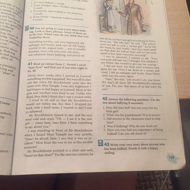 1. At first Jane quite happy, however, when Mr. Brocklehurst arrived, she felt great fear. When Jane had to stand on the chair and listen to Mr. Brocklehurst saying bad things about her, she felt ashamed and embarrassed.