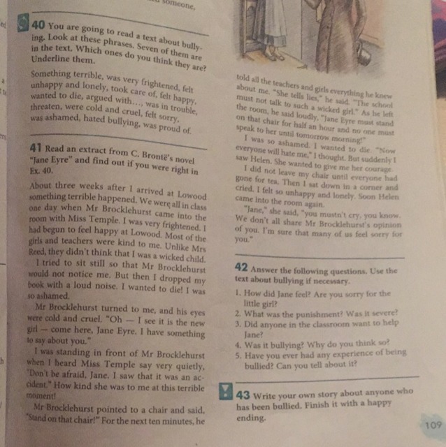 Многие девочки и учителя были добры ко мне. Кроме Миссис Рид, они не думали, что я была испорченным ребёнком. Я попыталась сесть смирно так, что Мистер Броклхёрст не должен был заметить меня.