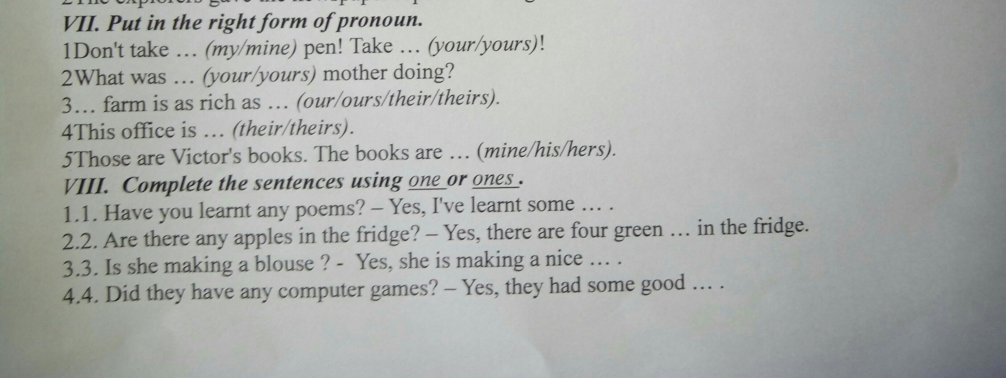 Первое упр. 1 my \ yours. 2 your. 3 our/theirs. 4 theirs. 5 his