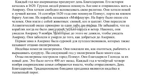 каждый день американцы празднуют день Благодарения. этот праздник начали отмечать в 1620 году. некая группа людей решили покинуть англию и жить в америке. они хотели новой и лушей жизни. 16 сентября 1620 года они покинули город. взяв с собой своих животных, пересекали они атлантический океан за один-два месяца. добравшись до америки, они высадлись на берег. в то время зима была суровой для путешественников. но к счастью индейцы помогли путешественникам. они научили их охотиться, рыбачить, выращивать кукурузу.