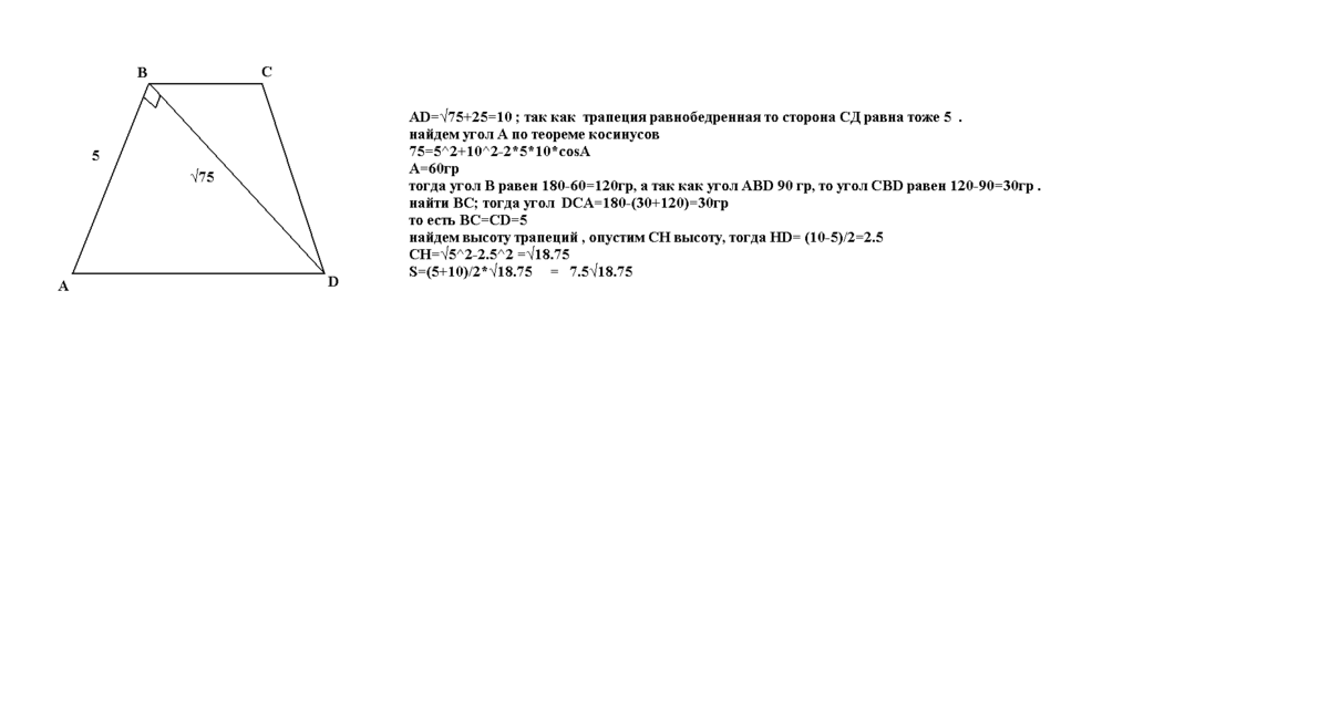 Диагональ равнобедренной трапеции перпендикулярна ее боковой стороне.Определить площадь трапеции ,если ее диагональ и боковая сторона соответственно равны √75 и 5