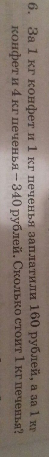 за 1 килограмм конфет и 1 килограмм печенья заплатили 160 руб. А за 1 кг конфет 4 кг печенья 340 руб. Сколько стоит 1 кг печенья