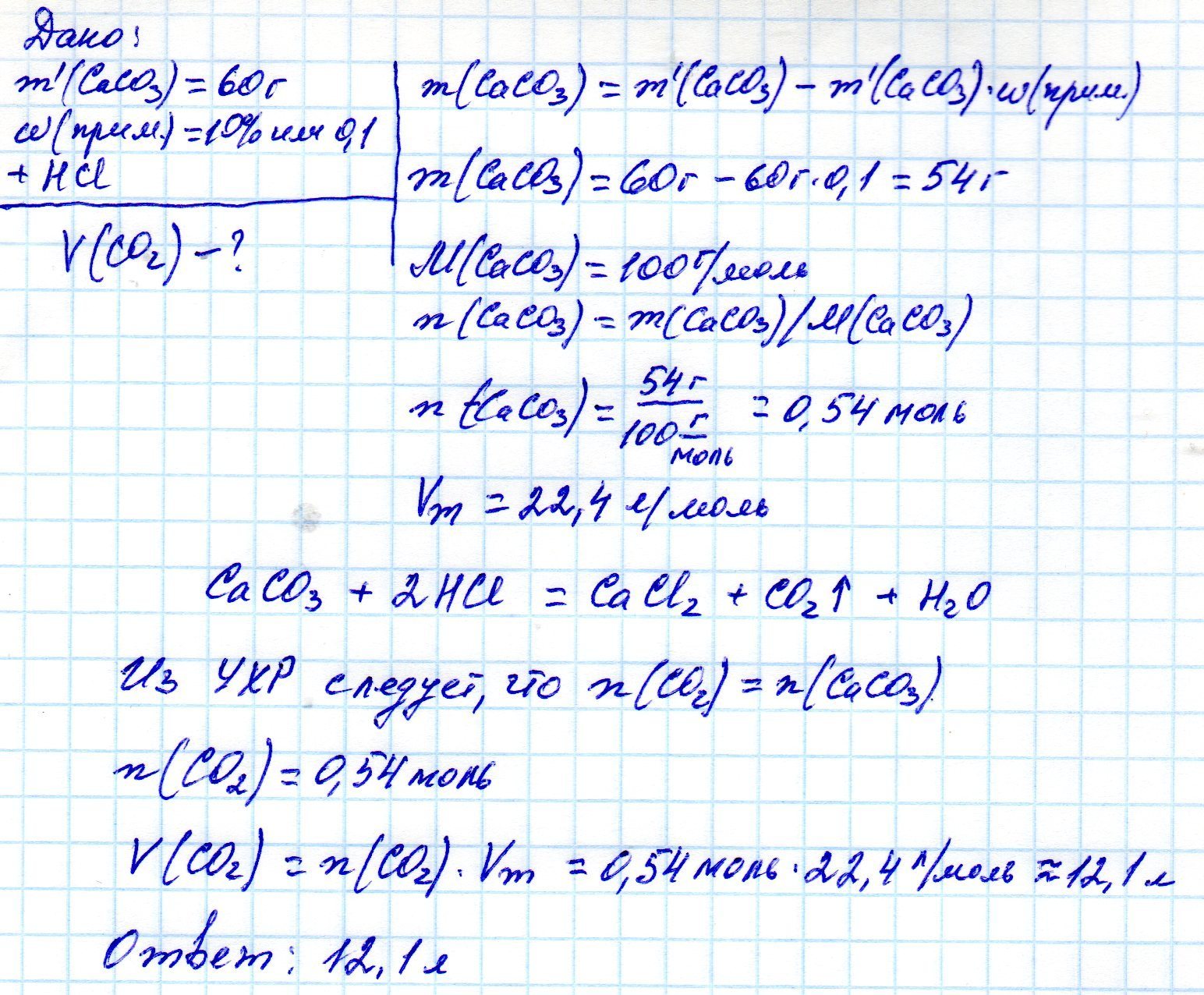 Какой объем оксида углерода (IV) образуется при взаимодействии 60 г карбоната кальция, содержащего 10% примесей, с соляной кислотой?
