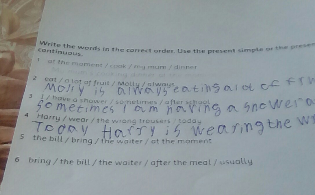 The waiter is bringing the bill at the moment. The waiter usually brings the bill after the meal.