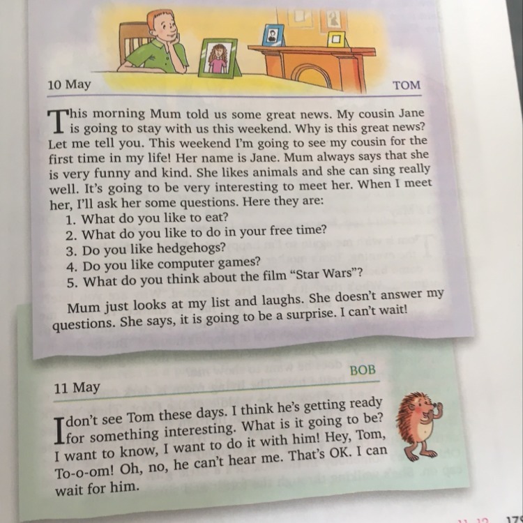 Этим утром мама сообщила нам великолепные новости. Моя кузина Джейн приезжает к нам на неделю. Почему это шикарные новости? Сейчас я тебе расскажу. На этих выходных я увижу свою кузину первый раз в жизни! Её зовут Джейн. Мам всегда говорила, что она очень весёлая и добрая. Она любит животных и очень хорошо поёт. Это будет очень интересно, встретиться с ней. Когда я с ней встречусь, я задам ей несколько вопросов.