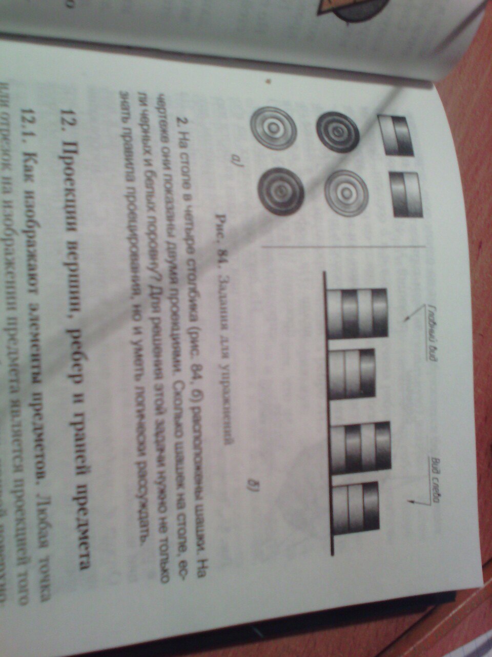 На столе в четыре столбика расположены шашки. На чертеже они показаны двумя проекциями. Сколько