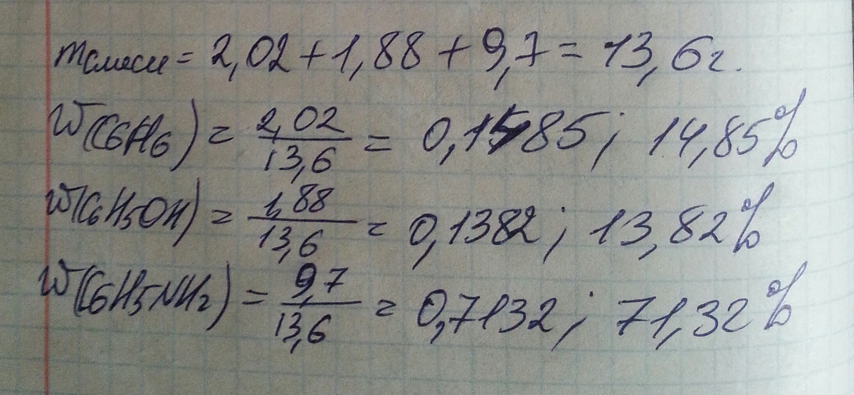 т.о. м.д. анилина, фенола и бензола сос-т соот-но (2.8/(2.8+1.88+7.8))*100 = 22.44%, (1.88/(2.8+1.88+7.8))*100 = 15.06% и (7.8/(2.8+1.88+7.8))*100 = 62.5%.