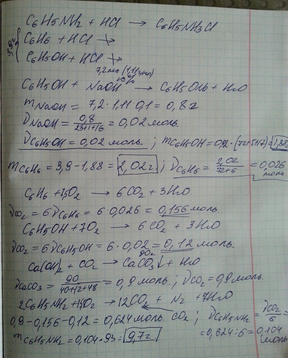 в свою очередь, n C = n CO2 = 0.9 моль; т.о. с учетом ранее пол-х данных о кол-ве в-ва C в анилине и феноле, пол-ся, что 0.9-(0.18+0.12) = 0.6 моль C - это кол-во в-ва C, сод-ся в бензоле C6H6 (М = 78 г/моль) кол-м в-ва 0.6/6 = 0.1 моль и массой соот-но 78*0.1 = 7.8 г;
