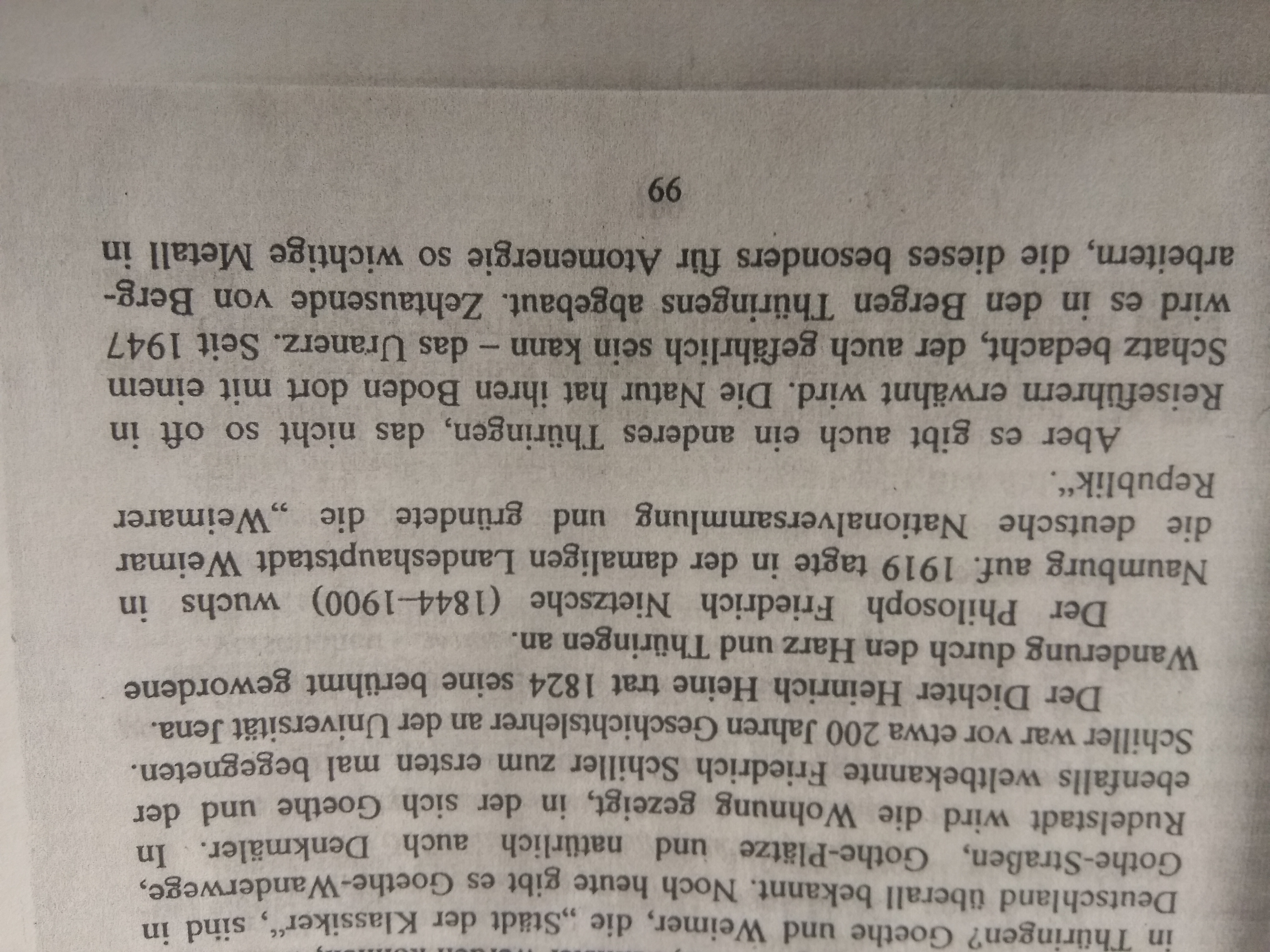 Веймар (везде) известен в Германии,как "Город классиков". Ещё сегодня имеются прогулочные маршруты Гёте, улицы Гёте, площади Гёте и конечно же памятники. В Рудольштадте была показана квартира ,где впервые встретились Гёте и всемирно известный Фридрих Шиллер. Шиллер был около 200 лет историком в Йенском университете(не уверена на счёт этого предложения). Поэт Генрих Гейне начал своё знаменитое путешествие через горы Харц и Тюрингию в 1824. Философ Фридрих Ницше вырос в Наумберге. В 1919 он вступил в тогдашнюю столицу земли Ваймара в немецкое национал.собрание и основал "Ваймарскую республику". Но еще есть другая Тюрингия, в которой не часто совершают путешествия. Природа имеет свою почву, в которой лежат богатства, которые также опасны,например-Урановая руда. С 1947 горы Тюрингии поменяли структуру. Десятитысячные рабочие гор, которые как атомную энергию так и важные металлы...