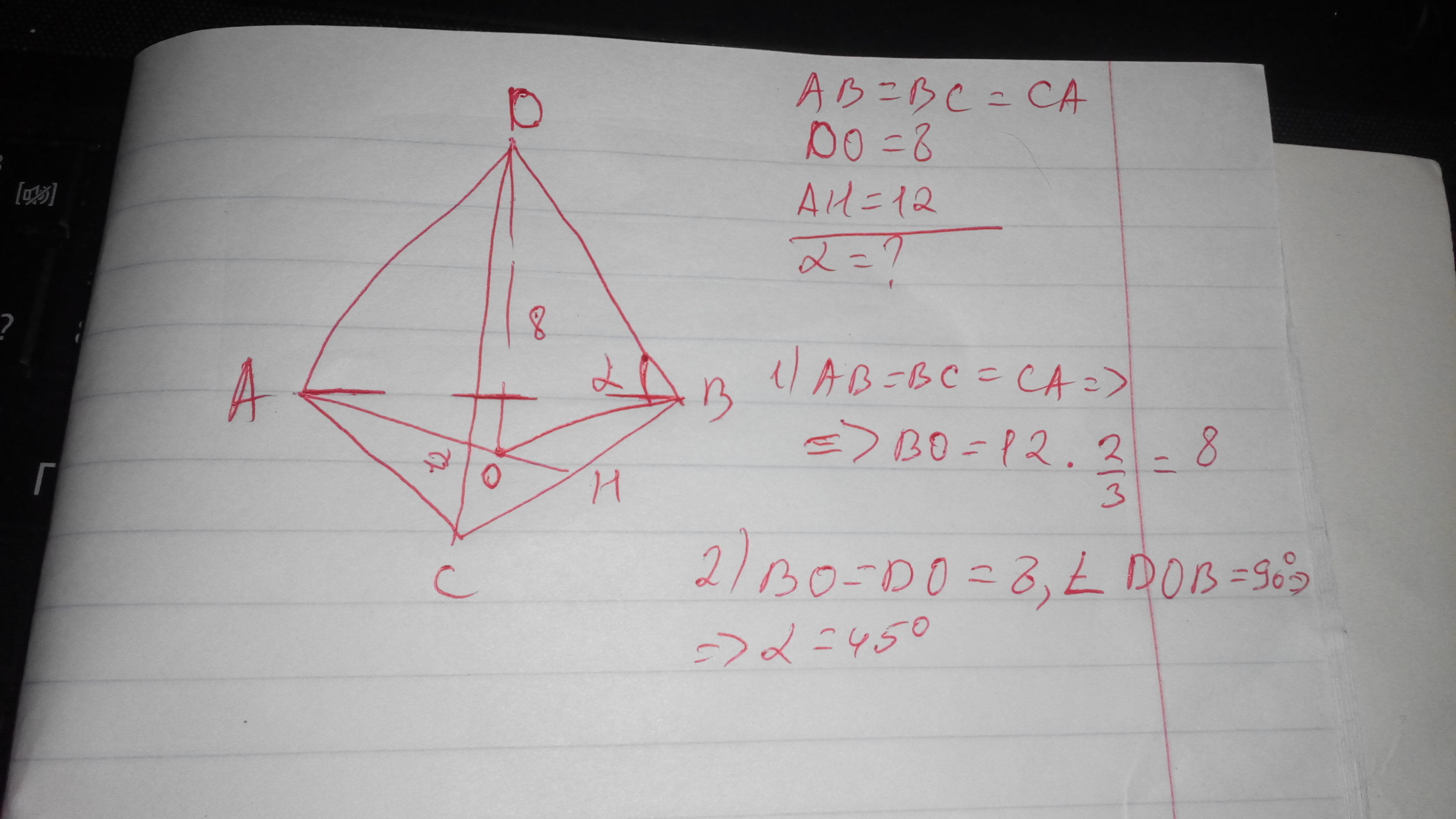 высота правильной треугольной пирамиды равна 8, а высота основания пирамиды равна 12. Найдите угол наклона ребра к плоскости основания. Ответ дайте в градусах