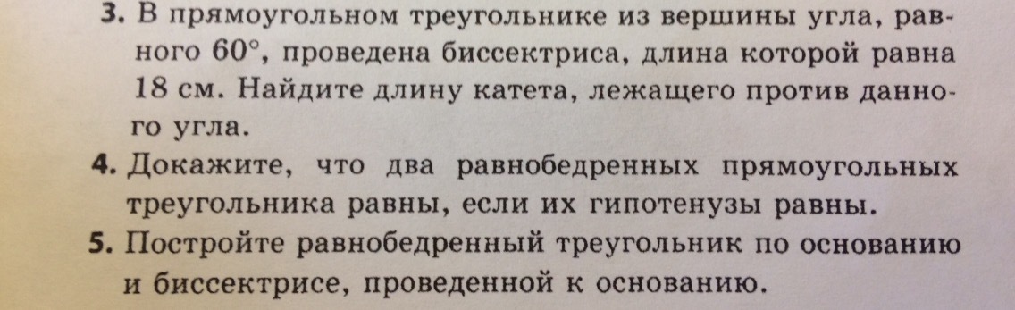 4. Рассмотрим два равнобедренных треугольника АВС (угол В- прямой, АС - гипотенуза) и OMN (угол М прямой, ОN - гипотенуза) с равными гипотенузами