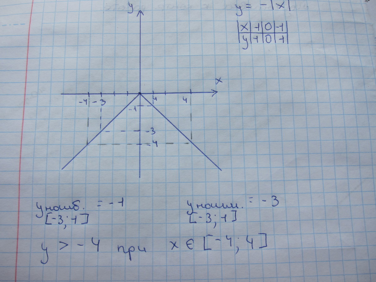 Помогите! постройте график функции у=-|x|. а) Найдите наибольшее и наименьшее значение этой функции на отрезке [-3;1]. б) укажите значения х, при которых у больше -4