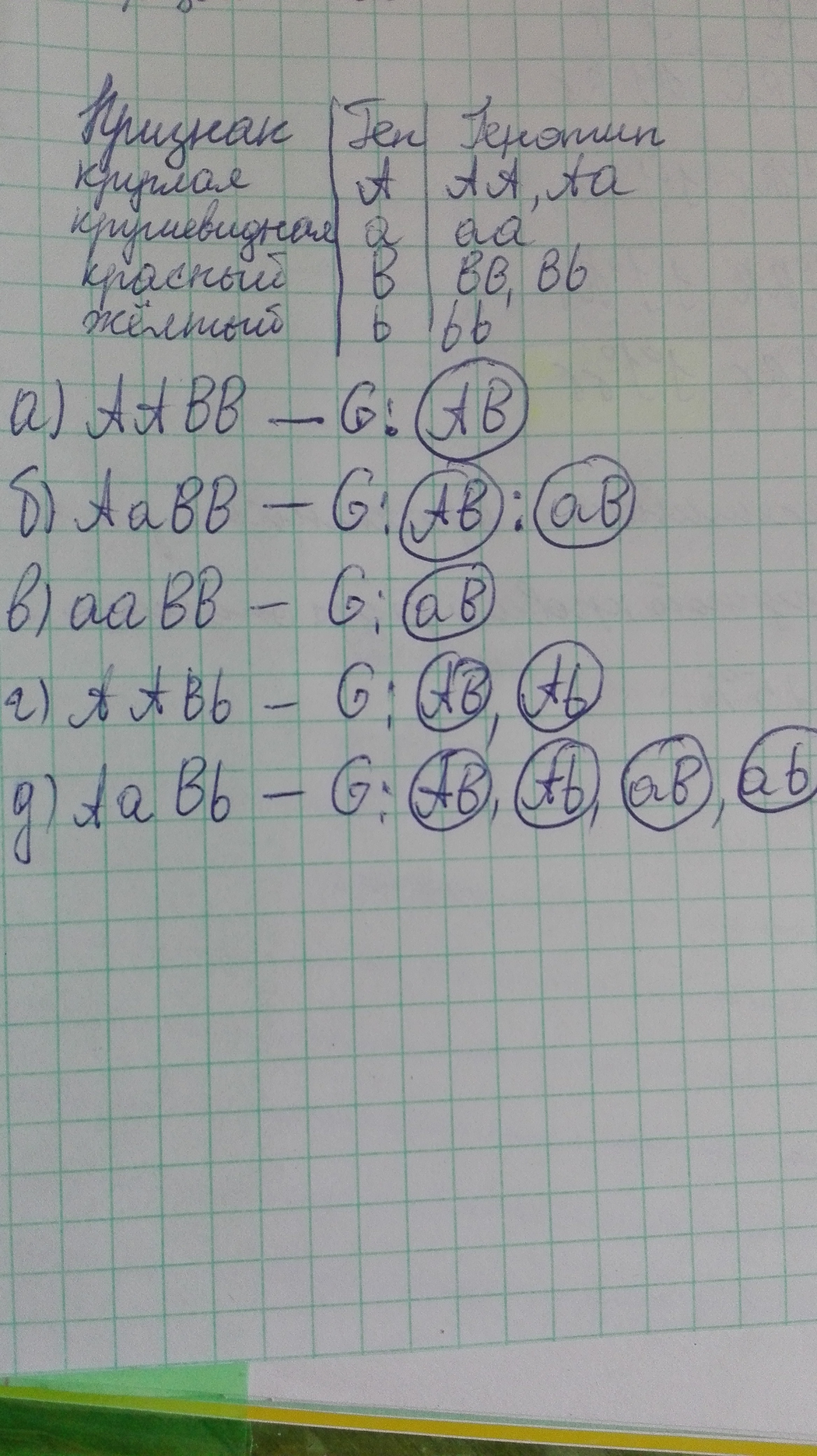 У томата круглая форма (А) плодов доминирует над грушевидной (а), а красный цвет плодов (В) - над желтым (в). Какие гаметы образуют растения томата, имеющие следующие генотипы: а)ААВВ; б)АаВВ; в)ааВВ; г)ААВв; д)АаВв?